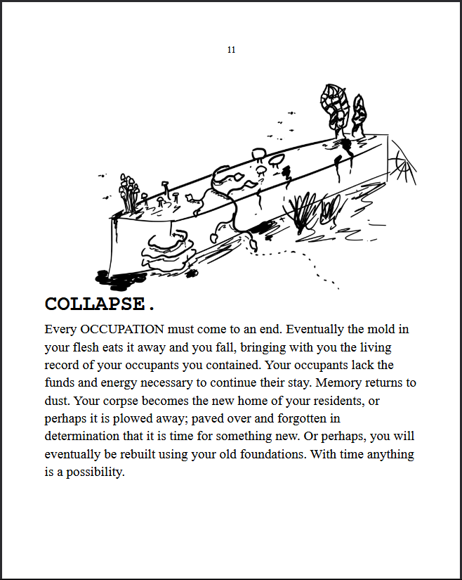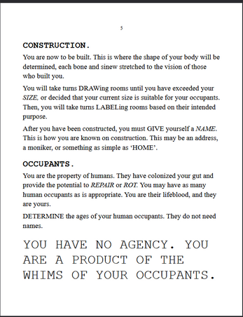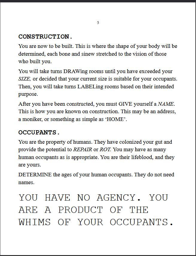 A small game about the life and death of homes from the perspective of the houses themselves. May be played alone or as a group.